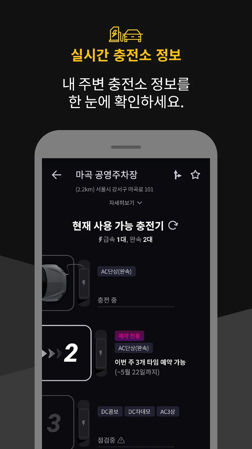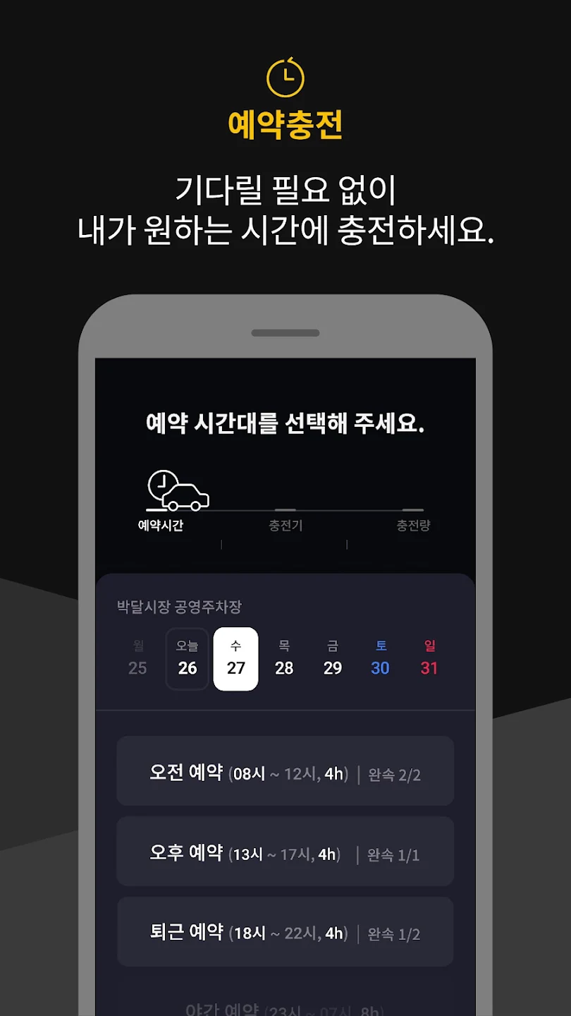 ① 이제 기다릴 필요 없이 내가 원하는 시간에 충전하세요. ② 내 주변 충전소 정보를 한 눈에 확인하세요. ③ 똑똑하게 분석해주는 이용내역 리포트를 받아보세요. ④ 매너출차하면 바로 쓸