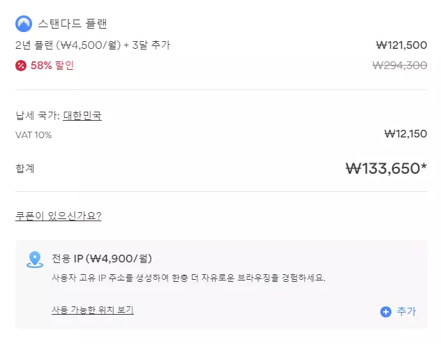 아래와 같이 쿠폰코드를 적용하고 부가세만 제거해도 미국 IP로 우회하여 Nord VPN를 구매하는 것과 비용에서 큰 차이가 없다. 더불어 국내 IP로 접속 시에 가능하면 시크릿 모드에서 해당 작업을 실행하는 것을 추천한다.