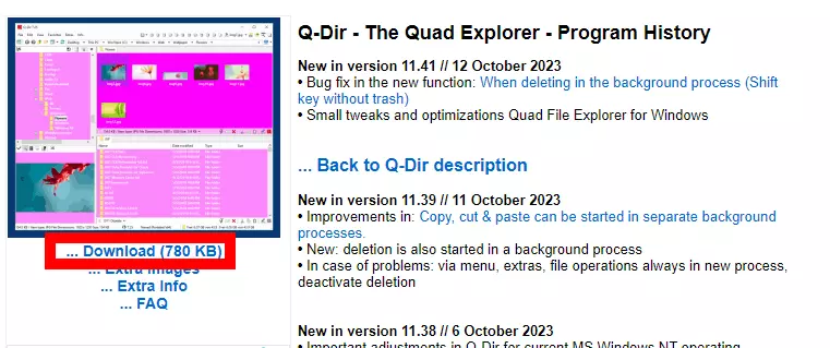 최신 버전의 Q-Dir 항목을 누른 후에 전환한 페이지에서 좌측 상단에 이미지 아래에 있는 Download 항목을 누르면, 다양한 버전의 Q-Dir를 볼 수 있다.