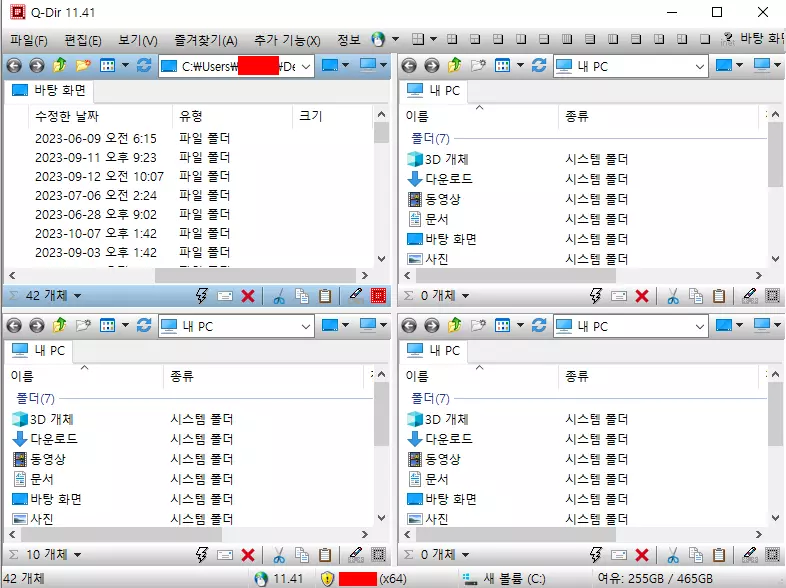더불어 해당 Q-Dir 프로그램은 설치형과 동일한 UI로 실행한다. 즉, 자신의 컴퓨터이고 Q-Dir를 자주 사용한다면 앞에서 소개한 설치형 Q-Dir이 적합하고 타인 또는 외부에서 임시로 사용하는 컴퓨터라면 Q-Dir 포터블 버전을 활용하면 된다.