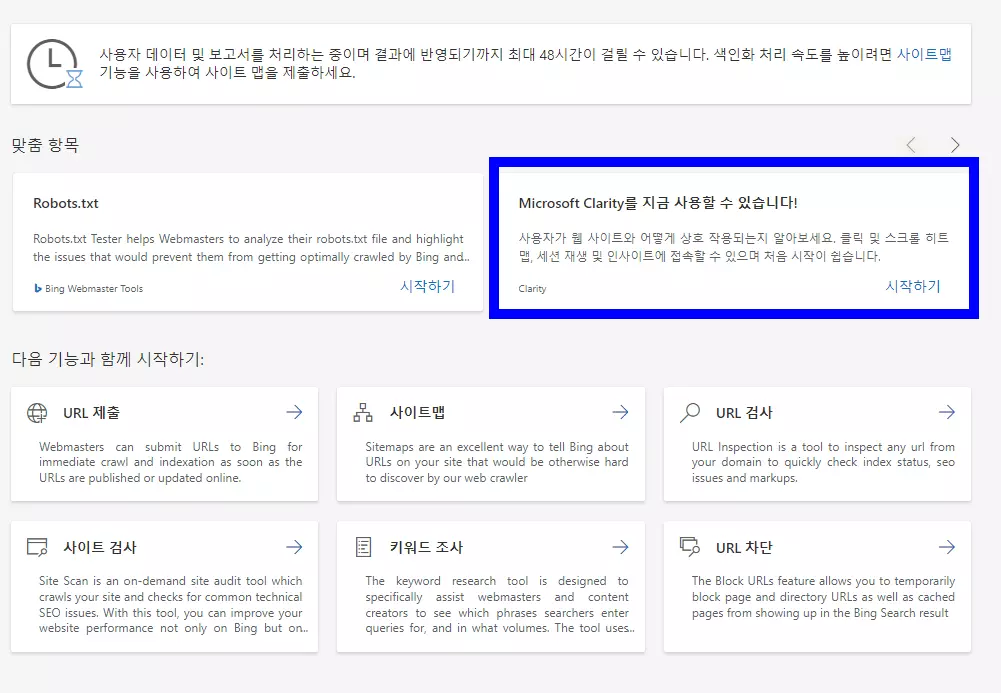 참고로, 방금 등록한 워드프레스 사이트가 좌측 상단에 나와야 정상적으로 빙 검색 엔진에 등록된 것으로 해당 도메인을 누르면 위와 같은 화면이 나온다. 여기에서 Microsoft Clarity 박스가 있는데 해당 유틸리티를 시작하기 버튼을 눌러 설치하면, 이후에 현재 등록한 워드프레스 사이트에 접속한 사람들이 어떤 식으로 자신의 사이트를 보는지, 더불어 어디를 클릭하는 지도 확인할 수 있다. 해당 Cliarity는 매우 흥미로운 툴이고 무료로 제공하므로 필요시에 설치하면 된다.