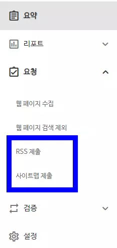 네이버 서치 어드바이저에 등록된 사이트 목록에서 해당 워드프레스 사이트를 누르면 위와 같은 페이지가 나오는데, 여기에서 요청 메뉴를 누르면 RSS 제출과 사이트맵 제출 항목이 있다. 해당 항목을 각각 눌러서 구글 검색 등록과 동일하게 작성하면 된다.
