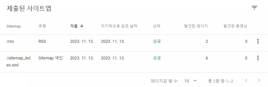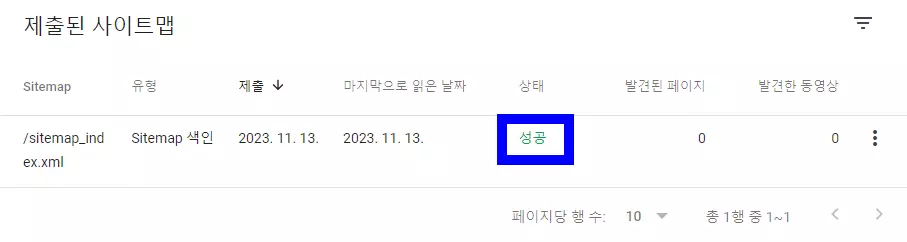 그런 다음에 사이트맵이 제출됨 팝업이 나오면 확인을 누르면 위와 같이 제출된 사이트맵에 해당 사이트맵이 추가된다. 처음에 등록하면 가져올 수 없음으로 나오는데 여기에서 F5 또는 상단의 페이지 새로고침 아이콘을 누르면 아래와 같이 상태가 성공으로 바뀌면 정상적으로 sitemap을 구글에 등록한 것이다.