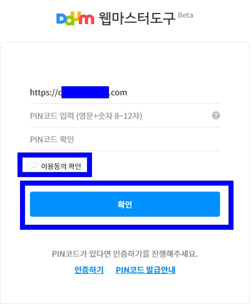 위와 같이 PIN 코드 발급하기를 누른 다음에 도메인을 입력하고 PIN 코드 입력란에 비밀번호를 생성한 후에 동일한 비밀번호를 PIN 코드 확인에 기재한 후에 이용 동의 확인 항목에 체크한다.