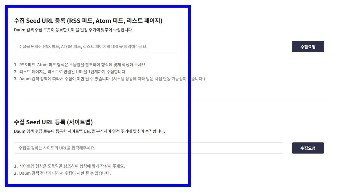 이후 해당 공간에 구글과 네이버에서 등록했듯이 rss와 sitemap_index.xml를 도메인명에 추가하고 수집 요청을 하면 된다.