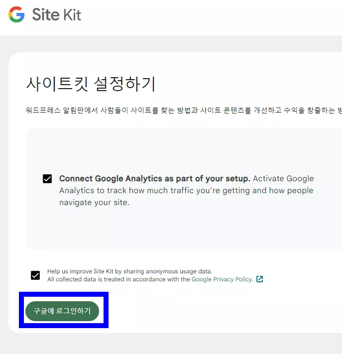 워드프레스 관리자 페이지에서 좌측에 있는 사이트킷을 누르면 위와 같은 화면이 나오는데, 여기에서 2개의 항목을 체크한 후에 구글에 로그인하기 버튼을 누른다. 이후 자신의 구글 계정을 선택해서 로그인한다. 아직 구글 계정이 없다면 해당 과정 전에 구글 계정을 생성한 후에 진행해야 한다.