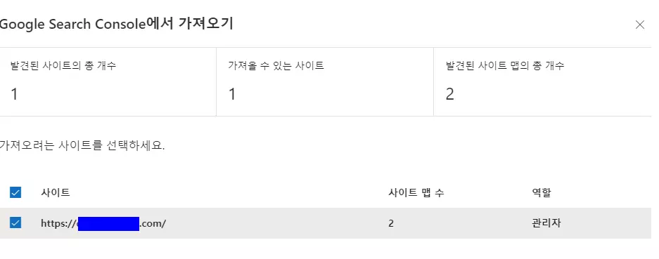 이후 나오는 팝업에서 허용 버튼을 누르면 위와 같이 구글 서치 콘솔에 등록한 사이트가 보이는데, 여기에서 하단에 있는 가져오기 버튼을 누른다.