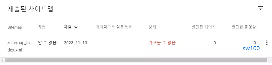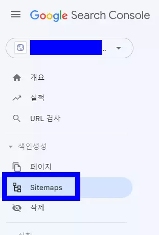 구글 서치 콘솔 페이지는 위와 같이 가장 상단에 자신이 설치한 워드프레스 사이트 도메인이 나오는데 여기에서 중간에 있는 Sitemaps 항목을 누른다. 그러면 우측에 새 사이트맵 추가 박스가 나오는데, 자신의 도메인이 있는 상태에서 사이트맵 url 입력이라고 적힌 공간에 sitemap_index, xml이라고 입력하고 제출 버튼을 누른다.