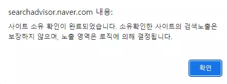 그런 다음에 다시 네이버 서치 어드바이저 웹사이트에 열려 있는 사이트 소유 확인 페이지에서 하단에 있는 소유 확인 버튼을 누른다. 그러면 위와 같이 소유확인이 되었다는 팝업이 나오면 확인 버튼을 누른다. 이후 사이트 목록에 추가된 해당 워드프레스 사이트를 누른 다음에 구글 검색 엔진에서 했듯이 sitemap과 rss를 동일하게 등록하면 된다.