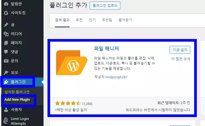 위에서 플러그인을 설치하는 방법을 살펴보았듯이 워드프레스 관리자 페이지에서 플러그인을 선택한 다음에 Add New Plugin을 누른 다음에 키워드 공간에 파일 매니저로 검색하면 위와 같은 파일 매니저 플러그인이 나타난다.