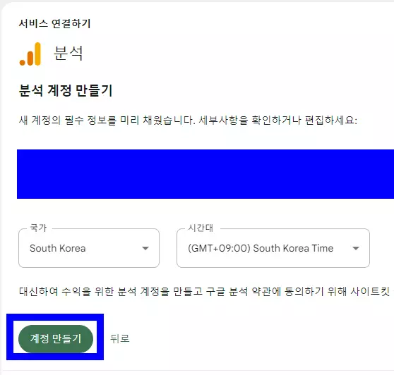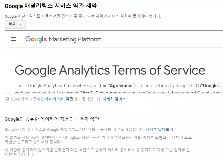 그러면 애널리틱스 서비스 약관 계약 페이지가 나오는데, 체크되어 있지 않은 2군데를 전부 체크한 후에 동의함 버튼을 누른다.