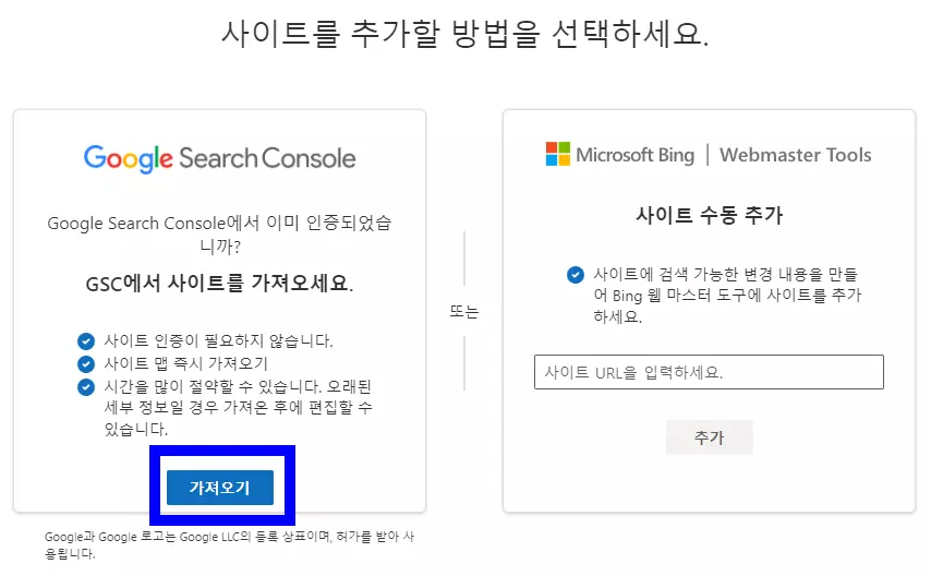구글 등 대부분 포털사이트에서 빙 웹마스터 도구로 검색하면 해당 빙 웹마스터 도구 사이트에 간단히 접속할 수 있는데, 접속하면 위와 같이 앞에서 구글 서치 콘솔에 등록한 워드프레스 사이트를 가져오기 버튼을 눌러서 간단히 빙에도 검색 등록을 할 수 있다. 참고로, 기존에 이미 여러 사이트들을 빙 웹마스터 도구에 등록된 상태라면 바로 위와 같은 화면이 뜨지 않는데, 이럴 때에는 왼쪽 상단에 기존에 등록된 사이트 목록에서 끝에 있는 사이트 추가를 누르면 상기 화면이 나타난다.