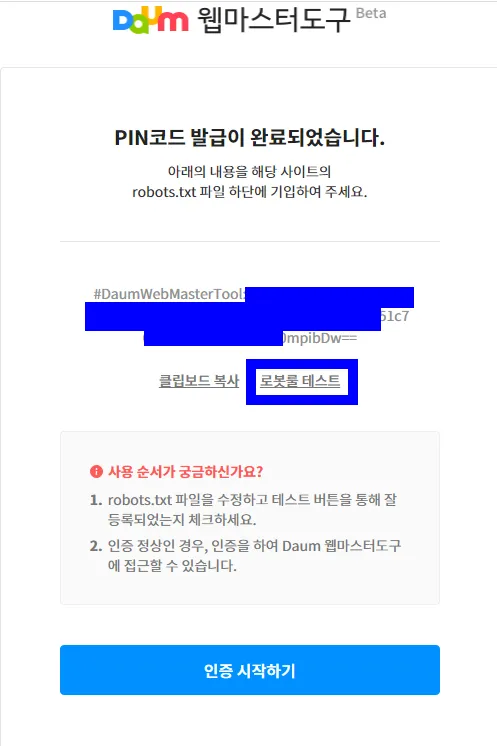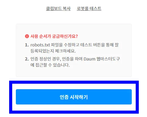 다음으로 웹마스터 도구에서 robots.txt에 복사했던 코드가 있던 팝업에서 하단에 있는 인증 시작하기 버튼을 누른다.