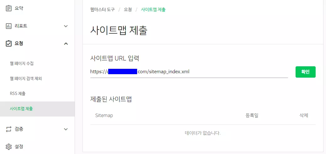 다음으로 사이트맵 제출 항목을 누른 다음에 구글 검색엔진에 등록한 그대로 해당 URL 뒤에 /sitemap_index.xml이라고 추가한 후에 확인 버튼을 누른다.