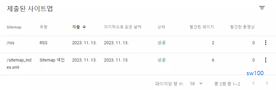더불어 처음에 rss도 상태가 가져올 수 없음으로 나오는데 F5 또는 상단의 페이지 새로고침 아이콘을 누르면 바로 상태가 위와 같이 성공으로 바뀌면 정상적으로 구글 검색 엔진에 워드프레스 사이트를 등록한 셈이다.