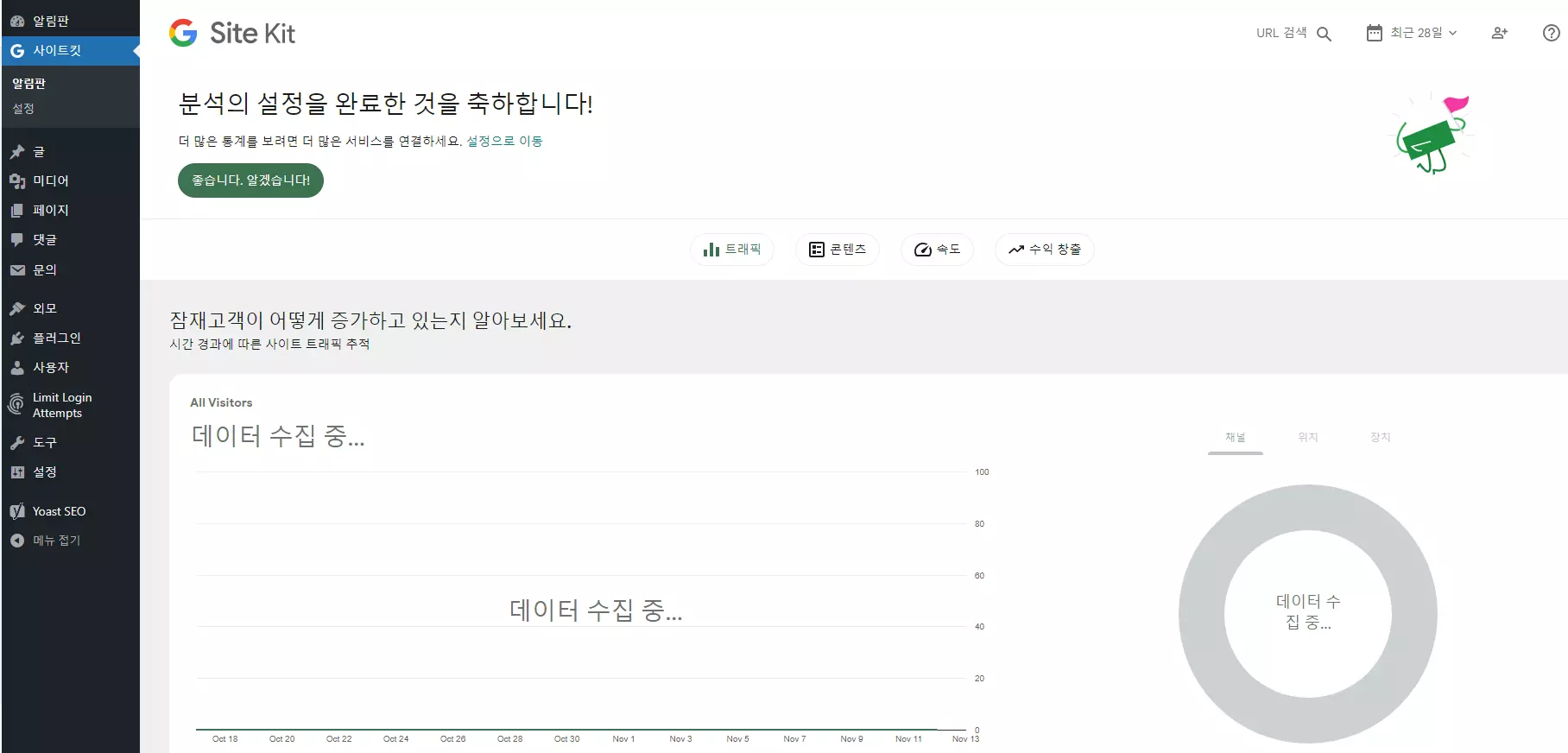 위에서 제시한 대로 워드프레스 관리자 페이지에 사이트킷 플러그인을 설치했다면 해당 사이트킷을 눌러서 간단히 구글콘솔, 애널리틱스 등에 한 번에 등록할 수 있다.