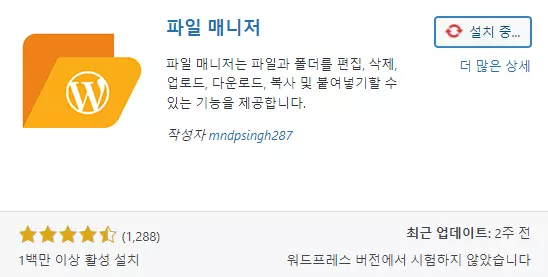 여기에서 지금 설치 버튼을 누른 다음에 활성화 버튼까지 눌러야 파일 매니저 플러그인 설치가 완료된다.