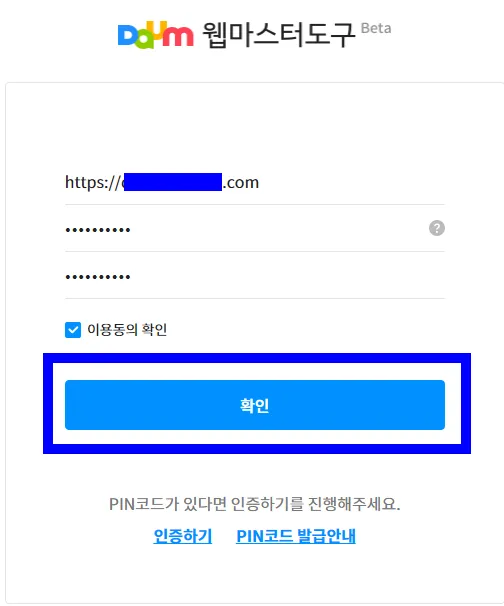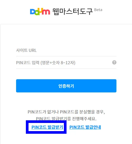 우선 다음 웹마스터 도구로 검색해서 해당 웹사이트로 접속하면 인증하기 팝업이 나오는데, 여기에서 우선 하단에 있는 PIN코드 발급받기 항목을 눌러서 PIN코드를 생성한다. PIN코드는 별개 아니고 그냥 비밀번호를 지정하는 게 전부이다.