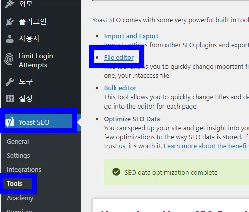 워드프레스 관리자 페이지에서 Yoast SEO에서 Tools 메뉴를 선택한 다음에 우측 화면에서 File editor 항목을 누른다. 이후 전환한 페이지에서 robots.txt 문구 아래에 있는 Create robots.txt file 버튼을 누르면 해당 robots.txt 공간이 나온다.