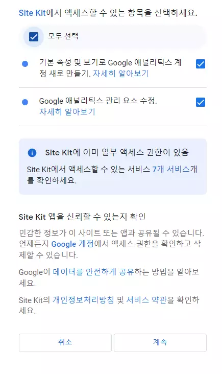 이후 팝업이 나오면 모두 선택 항목을 체크한 후에 계속 버튼을 누른다.