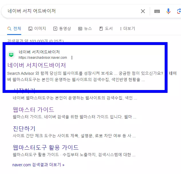 다음으로 네이버 검색 엔진에 해당 워드프레스 사이트를 등록하려면 네이버 서치어드바이저로 검색해서 해당 네이버 서치어드바이저 웹사이트로 접속한다.