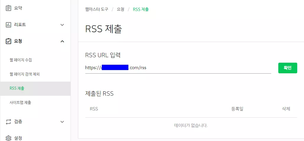 순서대로 RSS 제출 항목을 누른 후에 해당 워드프레스 도메인이 나오는 URL를 복사해서 붙여 넣은 후에 뒤에 /rss만 추가한 후에 확인 버튼을 누른다.