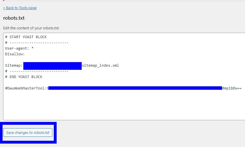 바로 여기에 앞에 다음 웹마스터 도구에서 복사한 코드를 열려 있는 robots.txt 공간에서 마지막에 붙여 넣은 후에, Save changrs to robots.txt 버튼을 누른다.