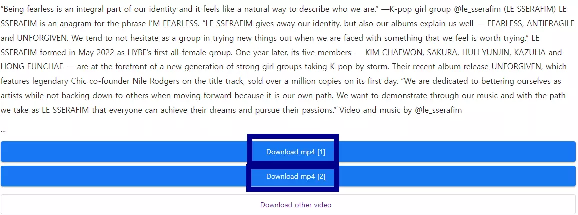 이후 iGram 사이트에 카피한 해당 동영상 URL를 붙여넣은 후에 다운로드 버튼을 누른다. 그러면 해당 인스타그램 내 영상 설명과 함께 하단에 2개의 다운로드 버튼이 나온다.