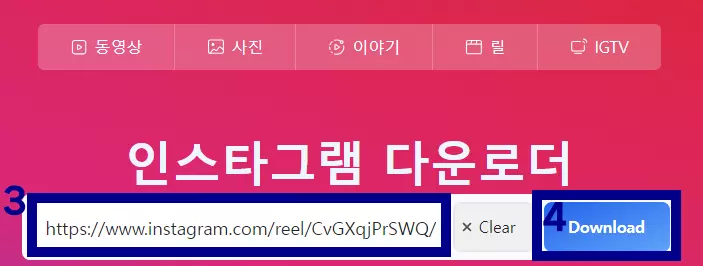광고 없는 iGram 사이트는 위와 같은 UI를 보여주는데, 우선 한국어로 나오지 않는다면 상단 우측에서 한국어를 선택하면 바로 한국어로 적용하므로 사용에 어려움이 없다. 또한 다른 iGram 사이트들과 동일하게 인스타그램에서 URL만 카피해서 해당 박스에 붙여넣는 동일한 방식이다.