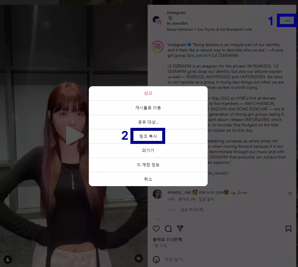 상기 영상은 인스타그램 공식 계정에 업로드된 르세라핌 동영상으로 해당 영상을 누른 후에 나오는 팝업에서 상단 우측에 가로점 3개를 누르면, 또 다시 팝업이 나오는데 여기에서 링크 복사를 눌러 해당 동영상 URL를 카피한다.