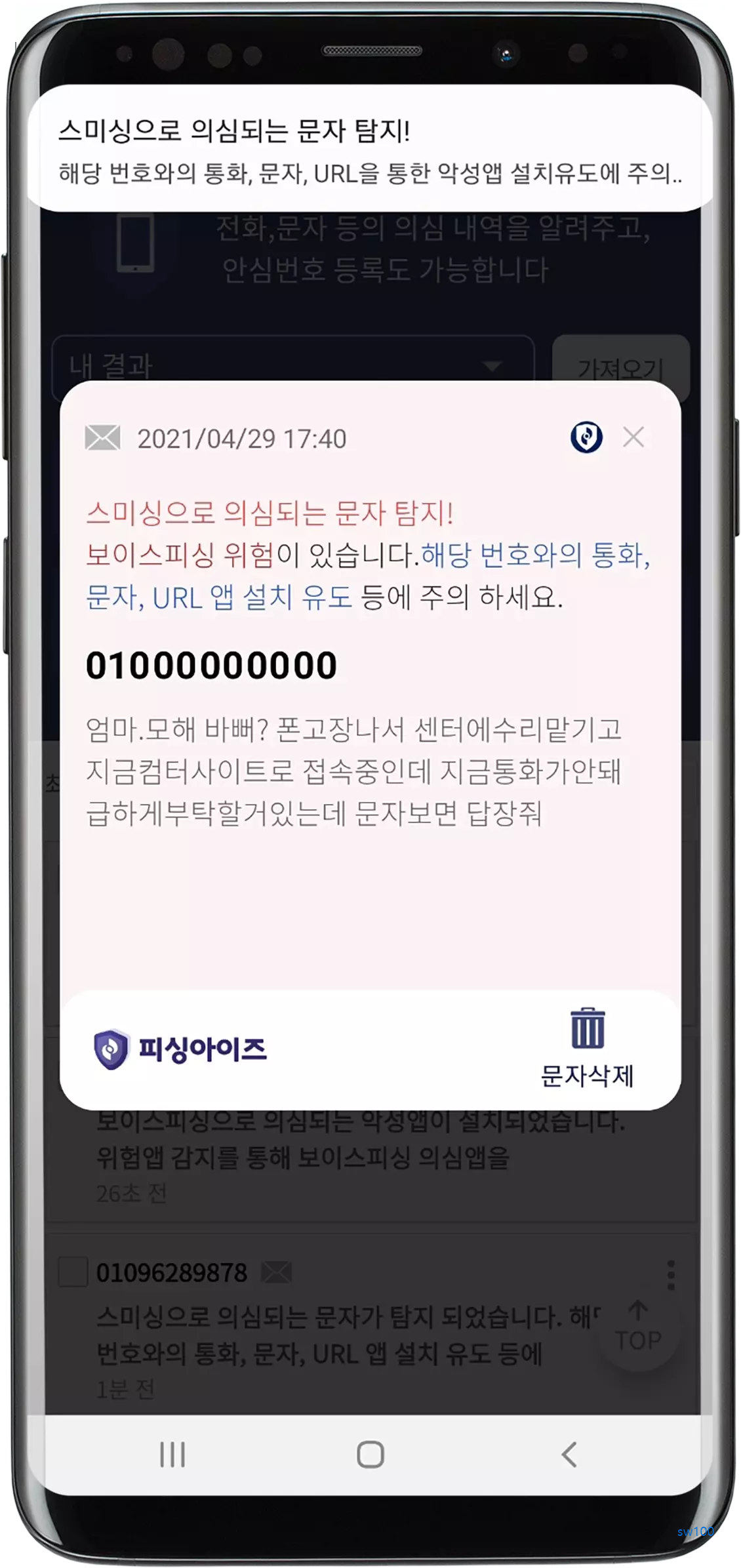 피싱 검사로 스미싱으로 의심되는 문자를 탐지하거나 보이스피싱 악성 앱 설치를 탐지하면 즉시 삭제해야 한다.